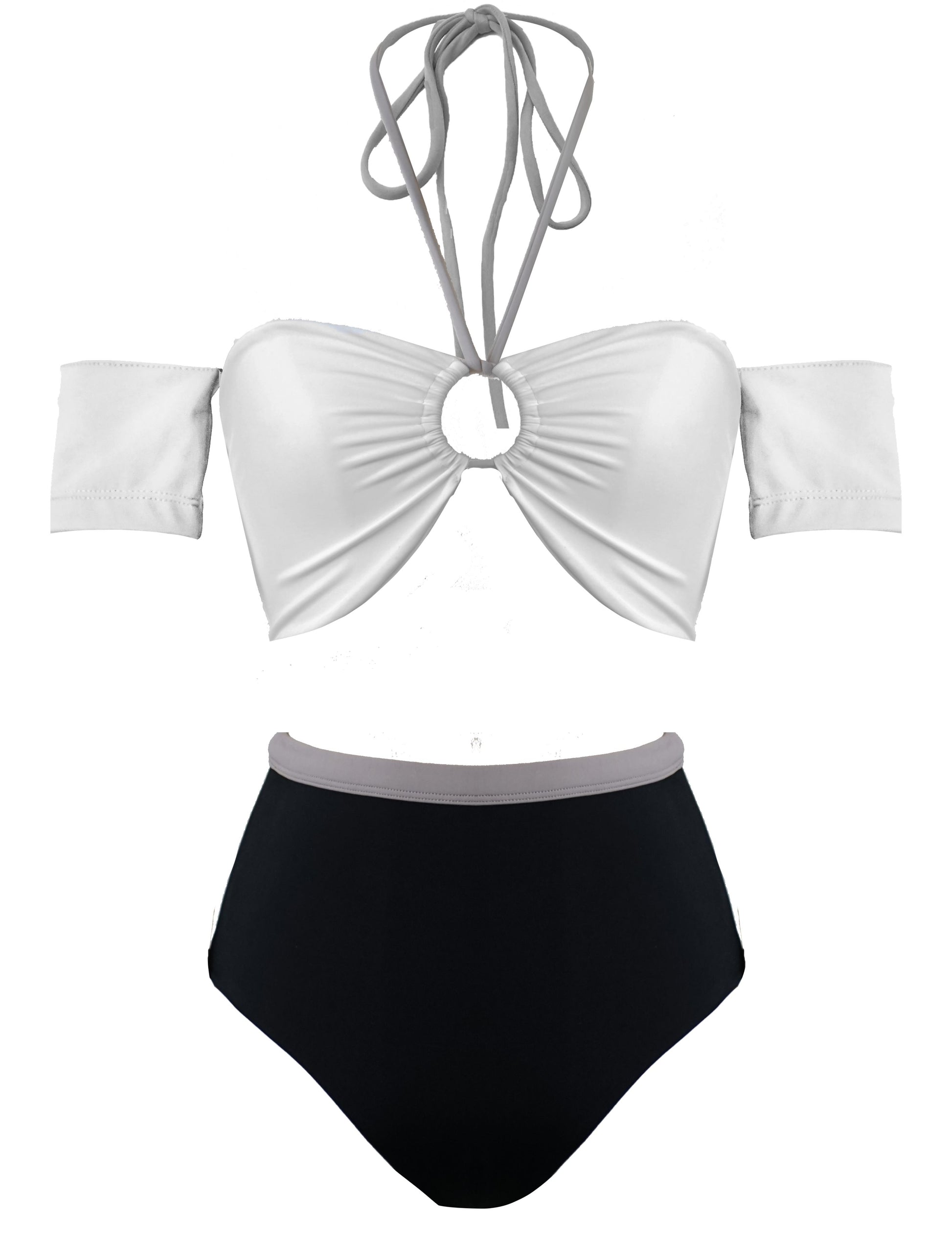 A heart shape neckline bikini features a short sleeve with an adjustable scrunch-up tie detail at the center that you can style it your way. Paired with a black high-waisted bottom with a khaki color waistband. A one-piece swimsuit with a halter V-neck features an adjustable tie on the neck.