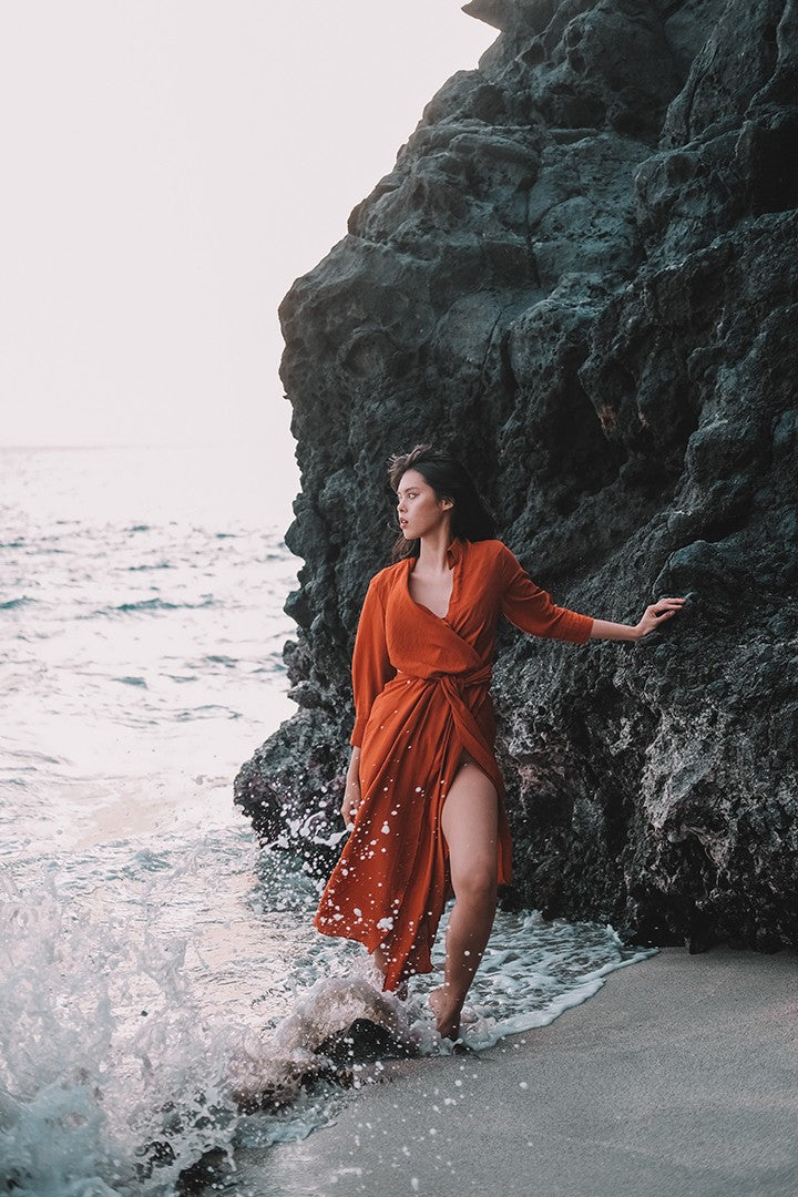 A classic timeless Wrapped-Shirt Dress with long sleeves that constructed from a flowy cotton fabric.