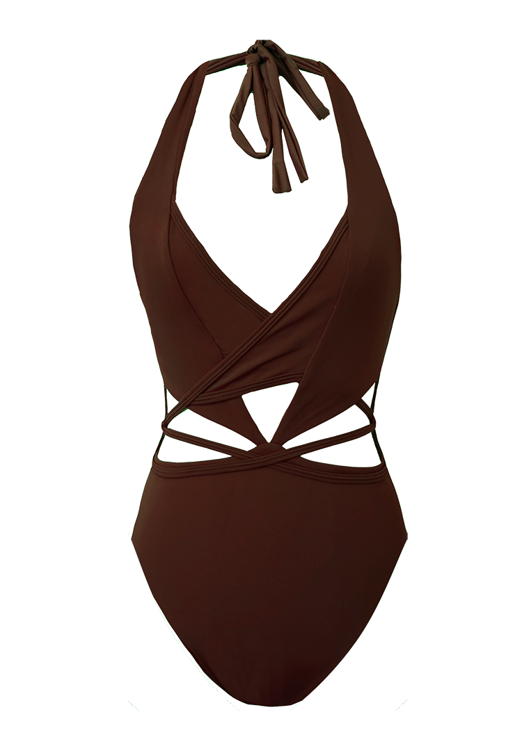 A one-piece swimsuit with a halter V-neck features an adjustable tie on the neck. Delmar has an eye for details on the waist with a little overlapping long tie that you can adjust and style your way. A swimsuit with a unique cut on the waist area.