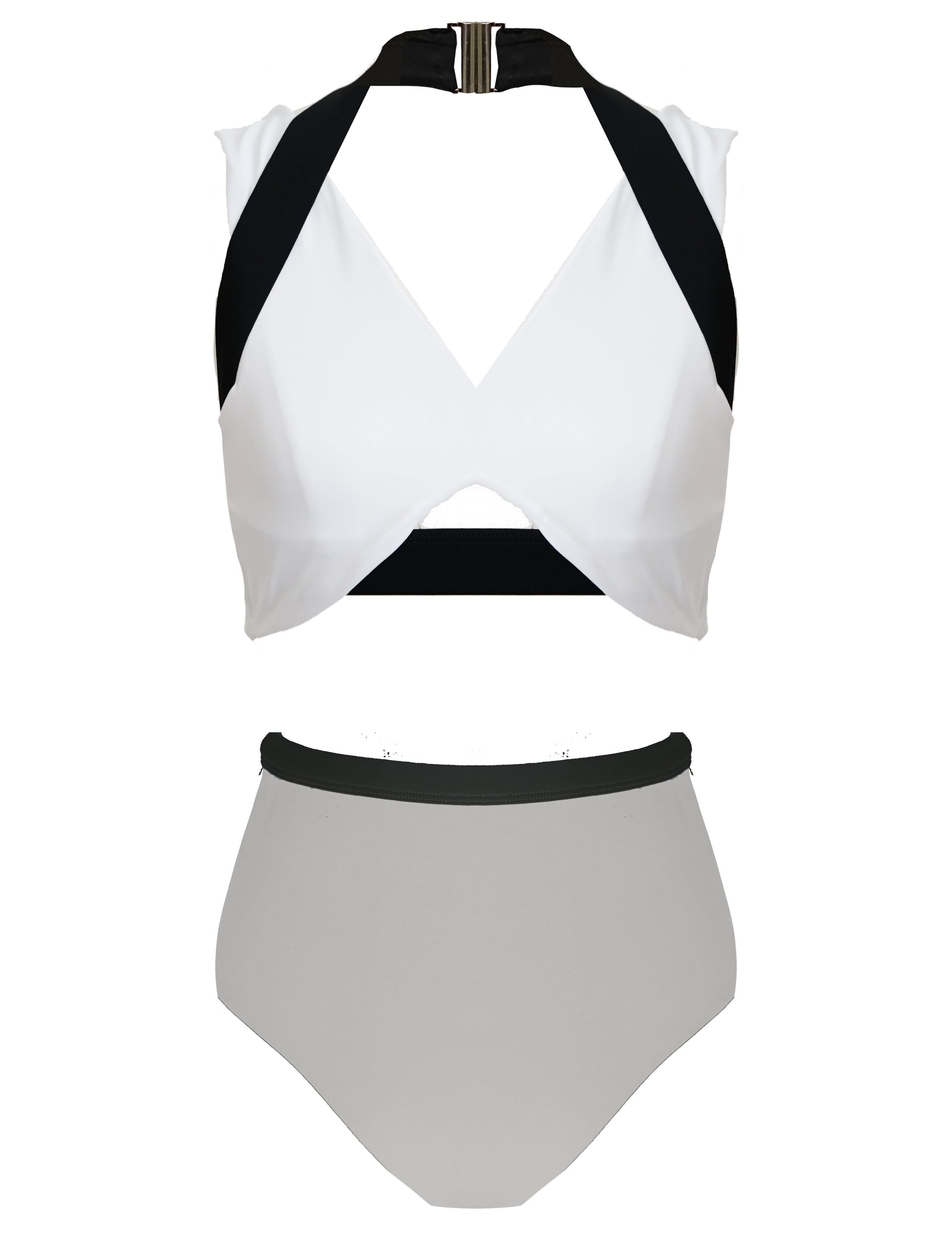 A constructed stylish two-piece bikini accentuating its unique X shape with three-tone color features a black thick strap that will hug your body perfectly with a thick gold metal clip closure on the back of the neck.