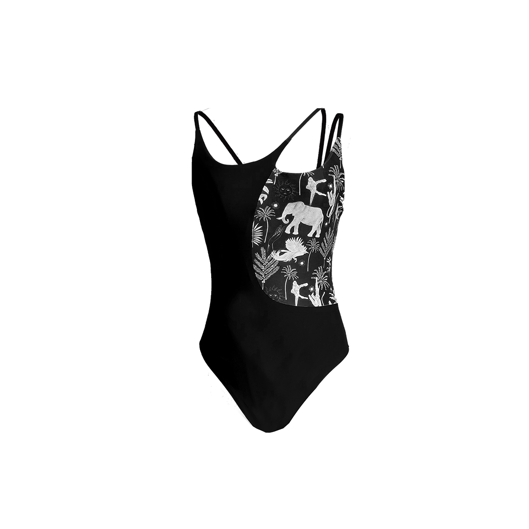 Introducing Hazel One Piece, a captivating swimsuit that stands out with its unique design. This swimsuit features a striking combination of half printed fabric and half black fabric, creating a bold and stylish look. The unique neckline, paired with a delicate spaghetti straps, adds an elegant touch to this modern piece.