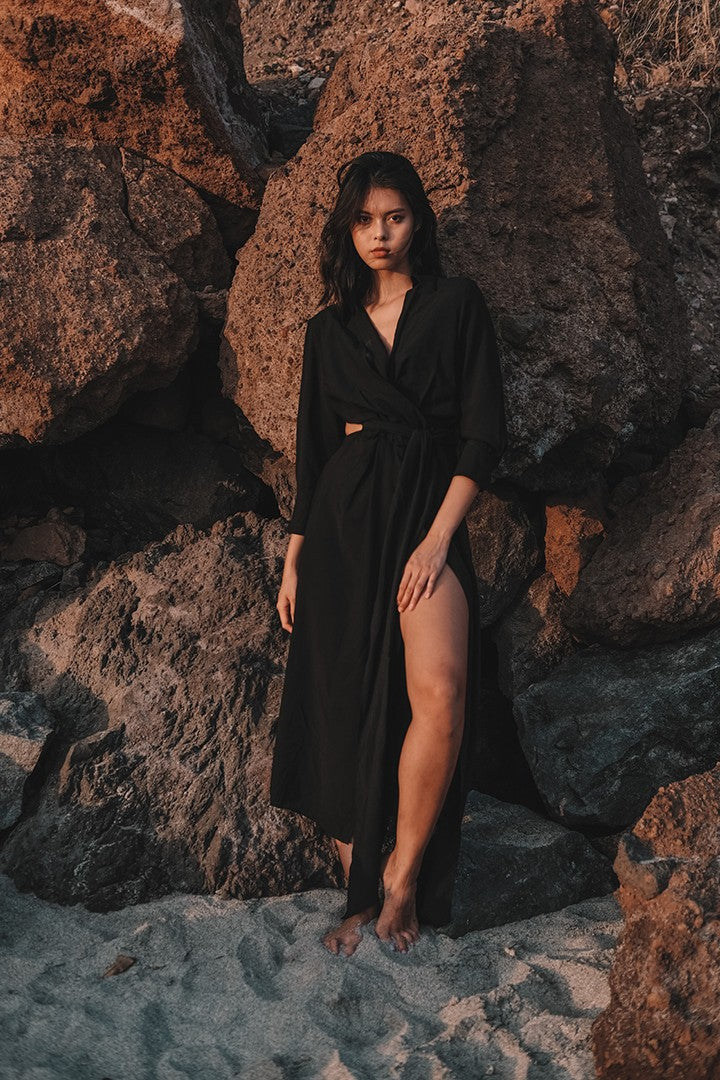 A classic timeless Wrapped-Shirt Dress with long sleeves that is constructed from a flowy cotton fabric.