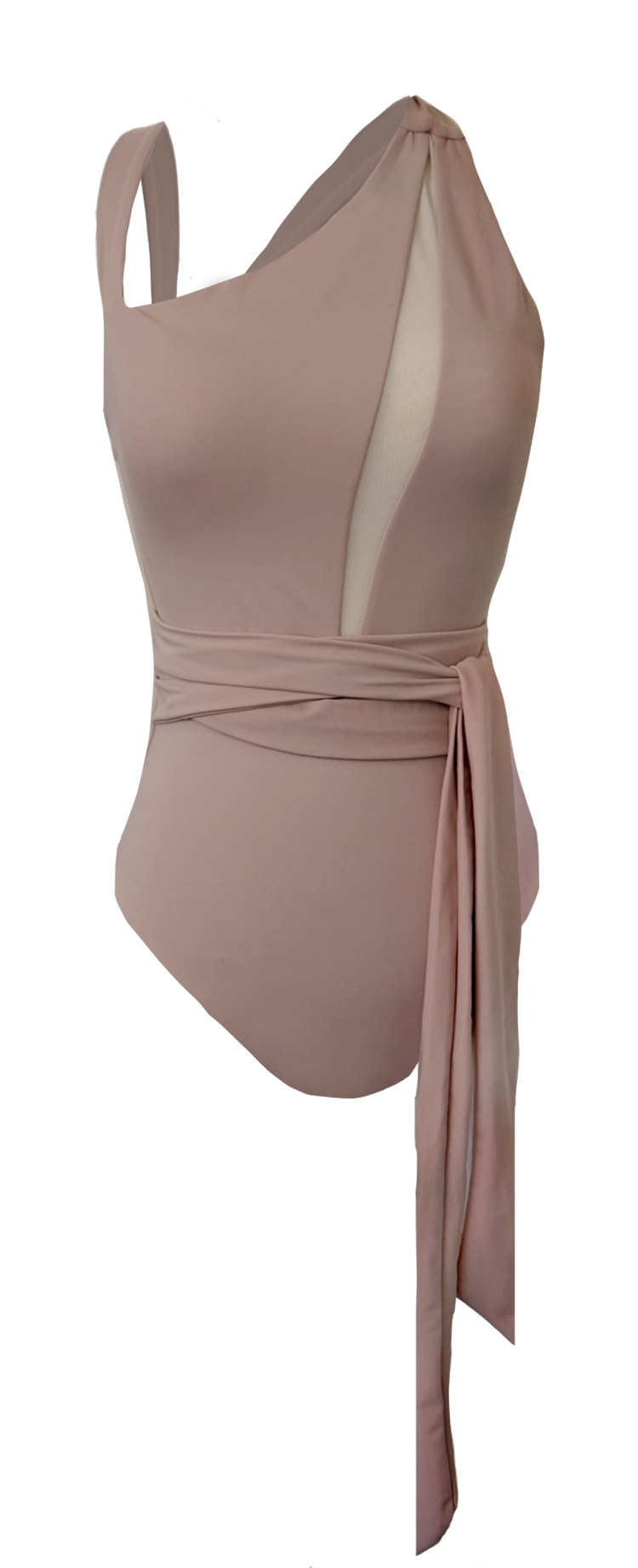 Another one-shoulder piece with a nicely see-through detail on the center bodice area features an adjustable belt to cinch your waist perfectly. Kano one-piece revealing bare back with a strap detail that connects from the front tie.
