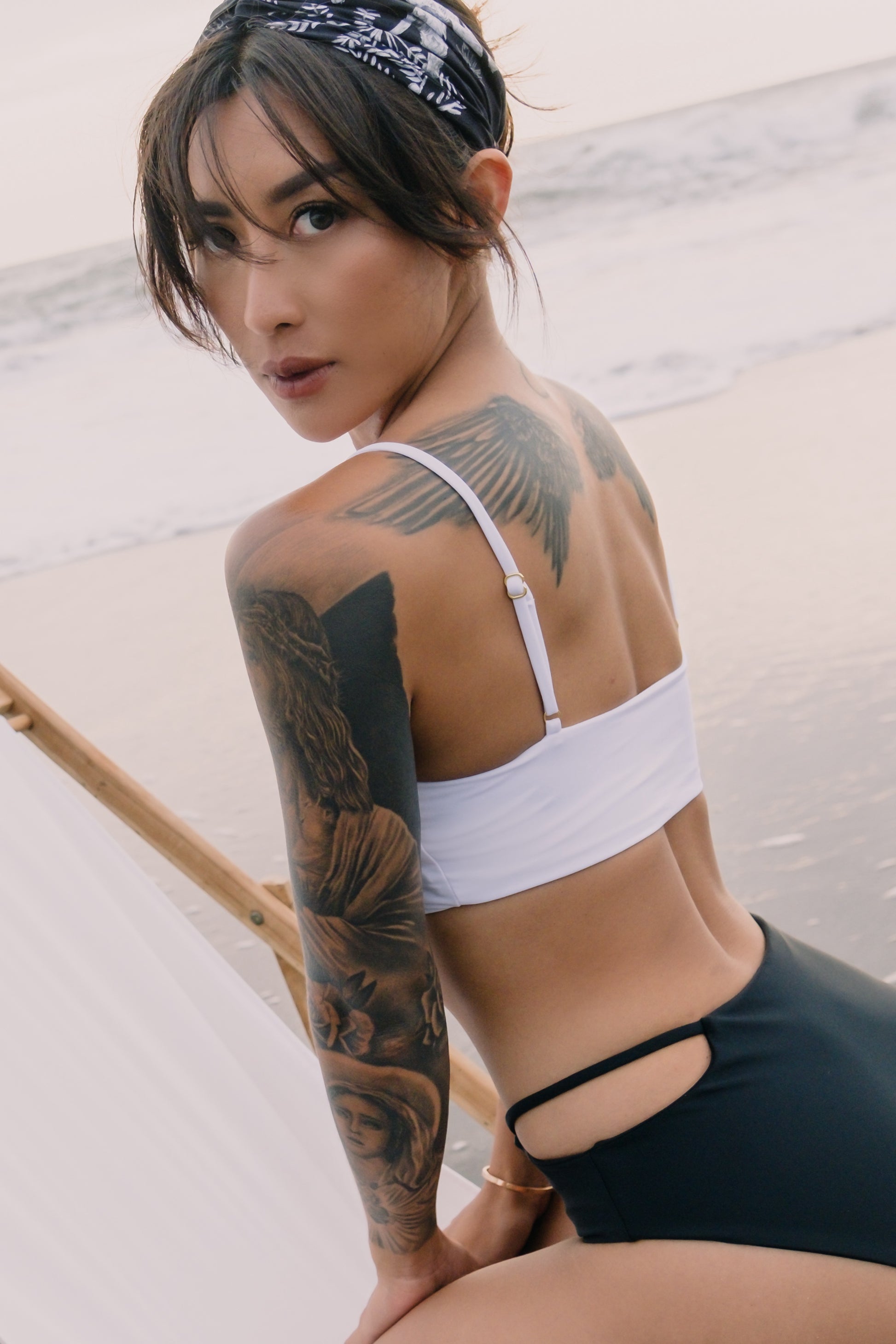 A timeless classic black and white bikini with a modern twist. The top features a straight line detail at the upper bust and adjustable spaghetti straps. The bikini bottom is designed with a subtle strap detail at the hip, showing some skin in this essential swimwear piece.