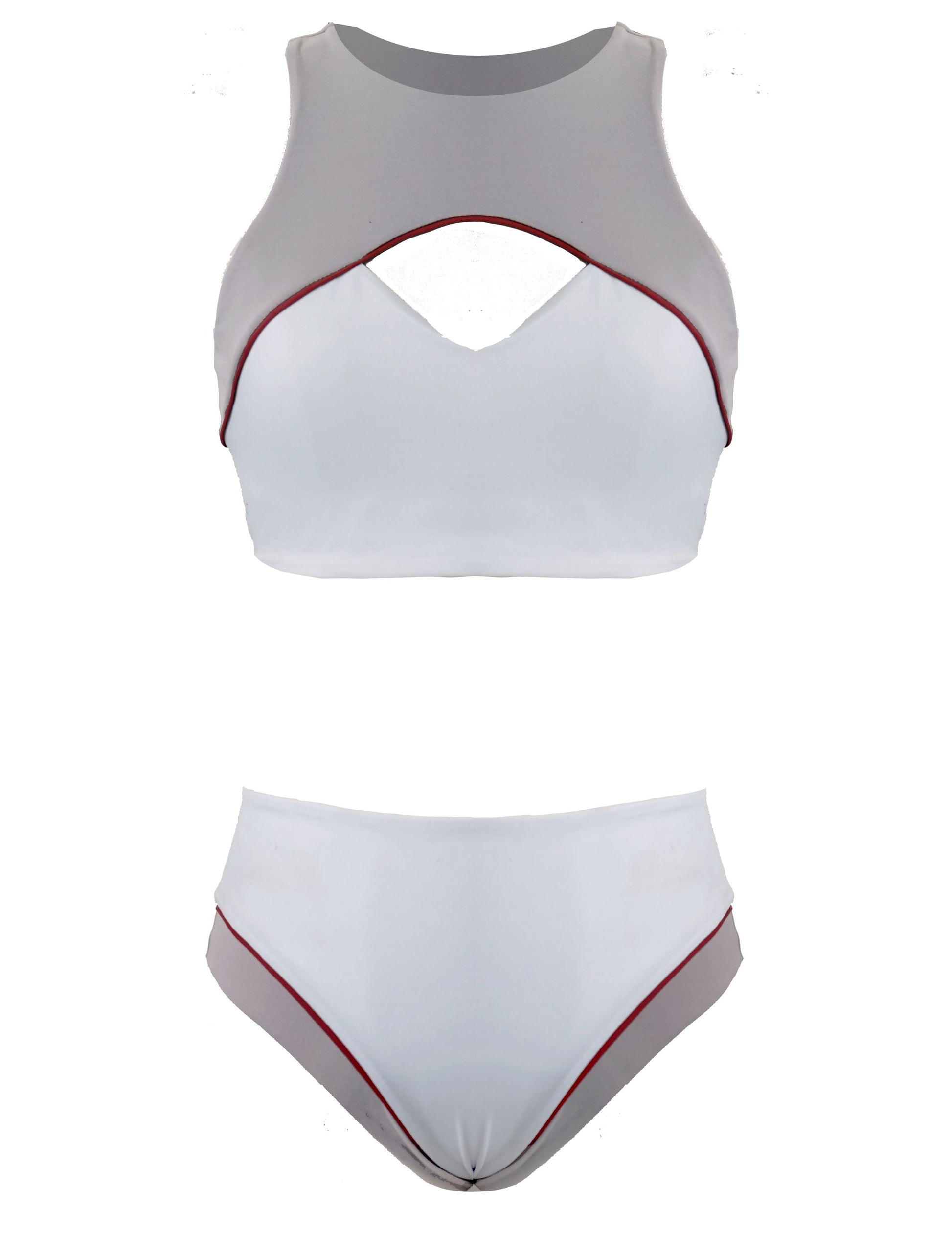 An edgy two-piece bikini comes with a high neckline and a cut out on the upper chest with a hint of terracotta lining detail features zipper closure on the back. Sovee bottom comes with a low-rise cut with extra fabric and orange line detail at the V line.