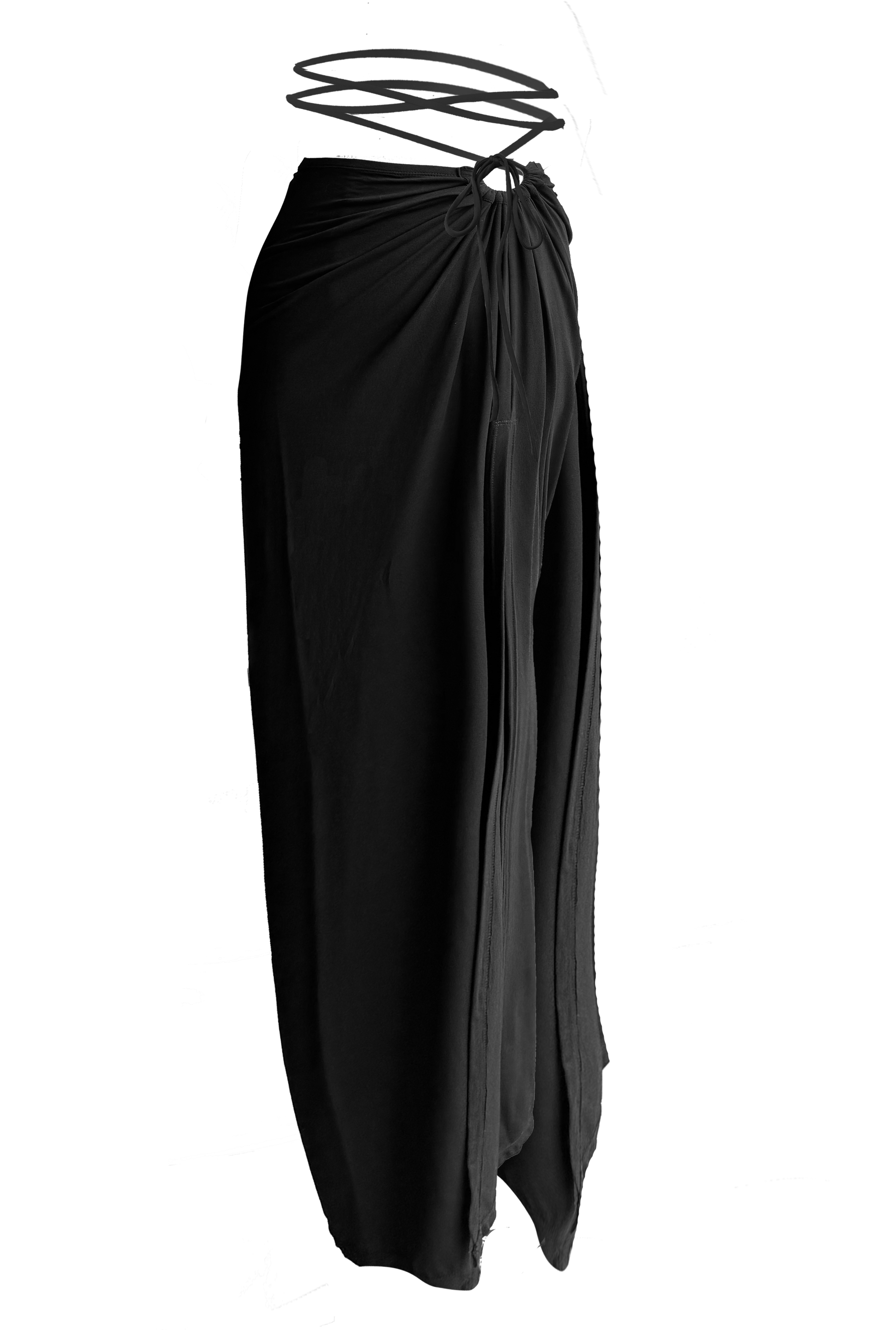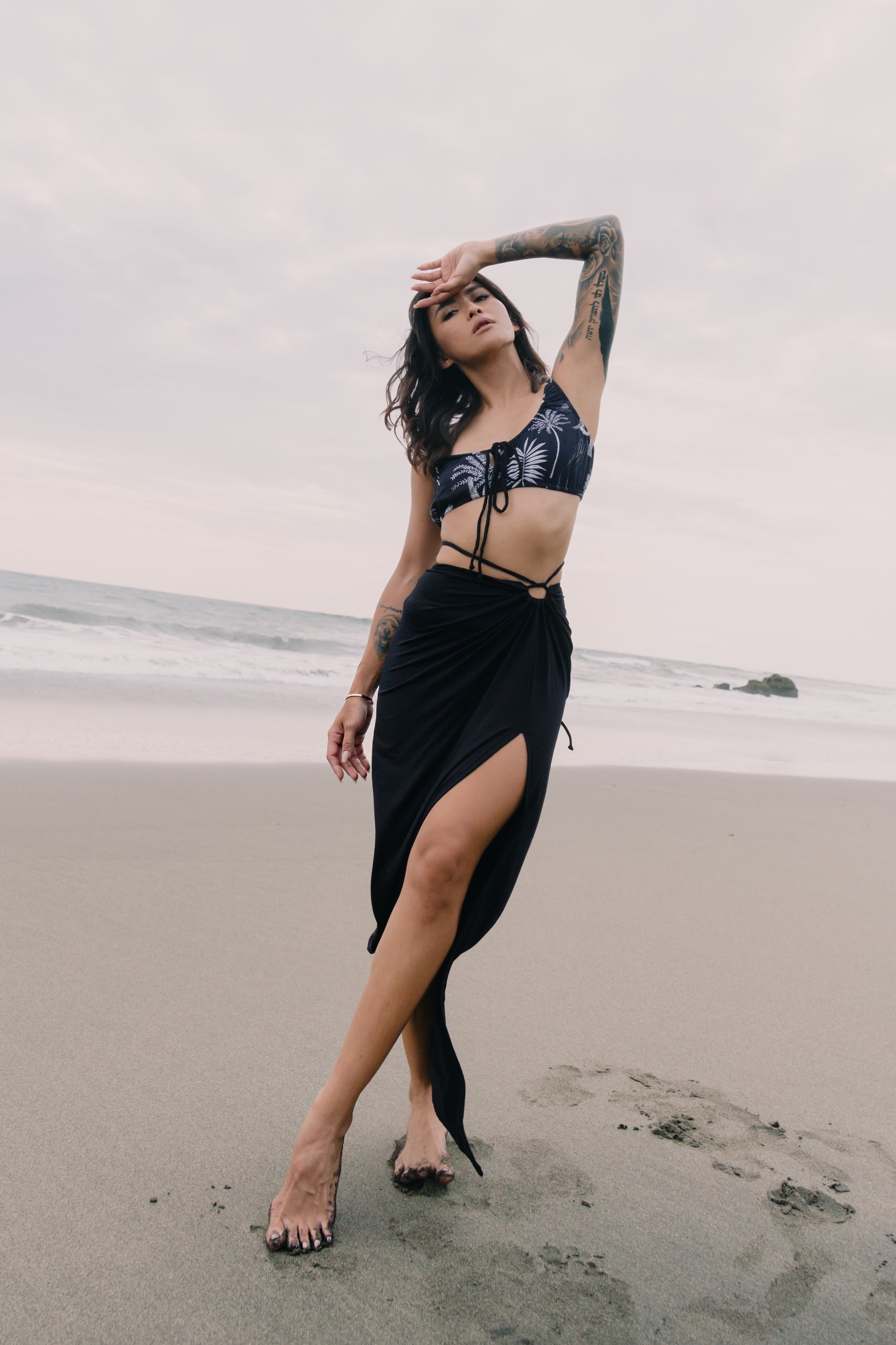 Meet Terra Skirt, your new wardrobe staple. This basic midi-length skirt features a stylish scrunch detail at the waist with a self-tie for a customizable fit. A high slit at the center adds a touch of allure and effortless movement. Perfect for both casual outings and dressy occasions. This skirt combines comfort and elegance in one chic piece.